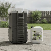 - Préparation du bac de récupération : remplir le réservoir avec 5 litres d’EMEROD Liquide conservateur et 10 litres d’eau. Le liquide doit former environ 2 cm d’épaisseur dans la cuve.