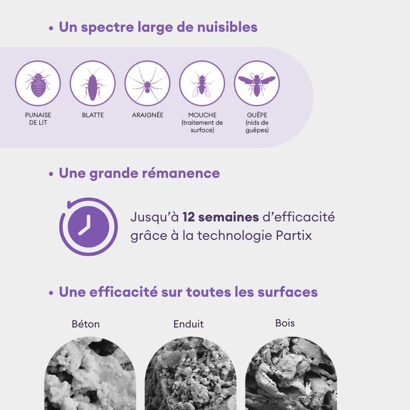 Usage intérieur : de 25 à 50ml (selon les cibles) de produit pour 5L d’eau pour 100m², Usage extérieur : 2ml dans 200ml pour traiter 1 nid |