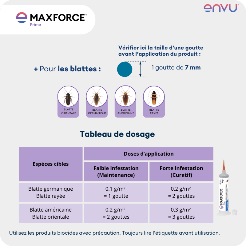 Blattes germaniques et rayées : 0,1 à 0,2g / m² = 1 à 2 gouttes Blattes orientales et américaines : 0,2 à 0,3g / m² = 2 à 3 gouttes |